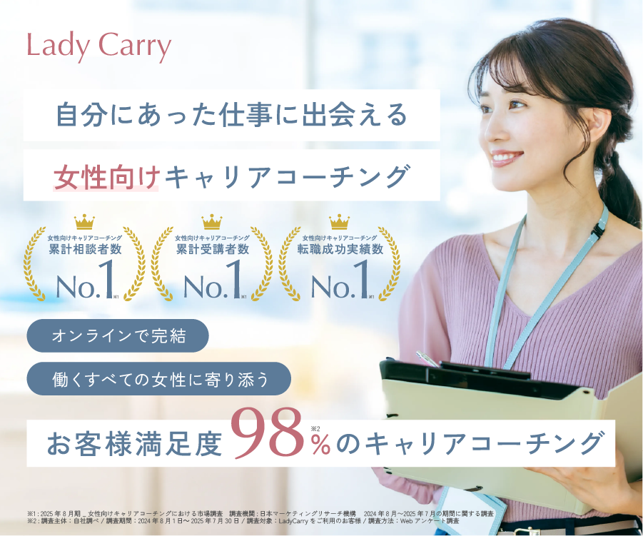 LadyCarry(ラディキャリ)では、キャリアコーチにより、転職だけでなく、副業・独立・現業維持など、あなたに最適なキャリア支援を行います。