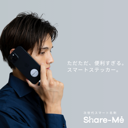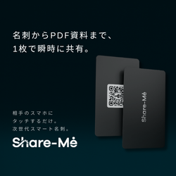 Share-Me(シェアミー)は、カードに内蔵されたチップ・QRコードを、相手のスマホなどで読み取らせることで、あなたの情報を相手に一瞬で伝えられる「スマート名刺」です。