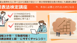 景表法検定講座は景品表示法(景表法)に関する「正しい知識」を学べるオンライン講座です。景表法検定講座には景表法検定1級試験がセットとなっています。景表法検定1級試験に合格すれば「表示等を管理するための担当者」(表示管理責任者)も満たせます。